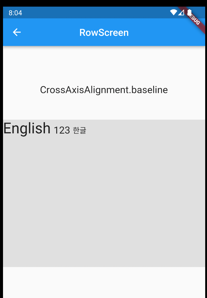 CrossAxisAlignment.baseline 특성은 약간 조건이 더 있습니다. 반드시 textBaseline 특성을 추가해야합니다. 이렇게 하면 Row위젯에 있는 Text 위젯들의 baseline을 맞출 수 있습니다.