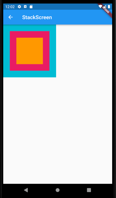 스택은 첫 번째 자식이 맨 아래에 위치합니다. 여러 위젯을 겹쳐서 사용하기 위해서는 자식 위젯을 순서를 잘 정해야 합니다. 자식 위젯으로 가로세로 200의 Container가 먼저 왔고, 그다음에 가로세로 150의 Container가 왔습니다. 때문에 렌더링 될 때 작은 사이즈의 150 Container가 더 위에 그려집니다.