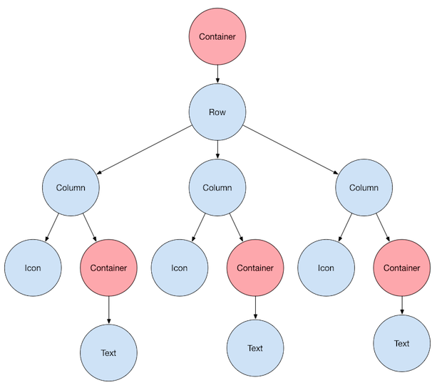 Container안에 Row가 있습니다. Row에는 3개의 Column이 있는데 각 컬럼 안에는 Icon과 Container위젯이 하나씩 있습니다. Container위젯에는 Text가 들어가 있습니다.