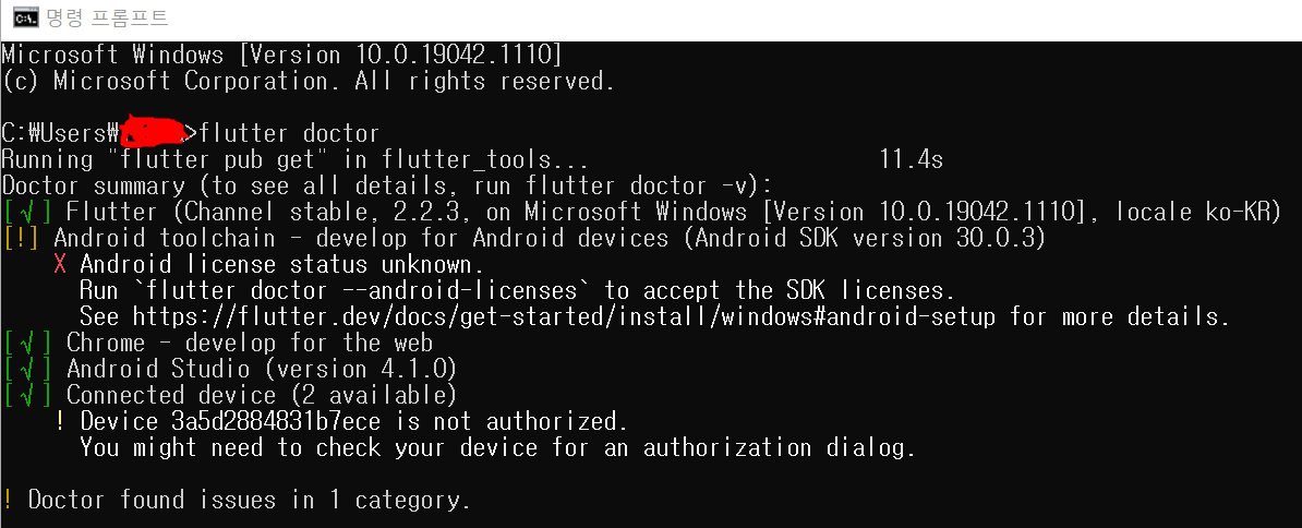 7. 다시 cmd에서 flutter doctor 입력하여 상태 확인
